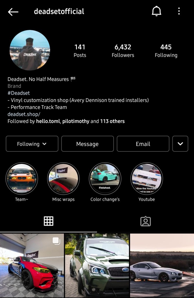 At Deadset Designs, I run their Instagram page and also am a brand ambassador. Organically, we grew to 6000+ followers to that help bring in new customers to our humble Automotive Vinyl shop.